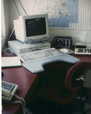 *Chair height-adjustable, forward tilt seat pan, lumbar support; change adjustments frequently for posture variety. *Monitor squarely in front, not to side; monitor height places vision angled down 5 to 15 degrees below horizontal. *Desk height places elbows at 90 degrees with fingers on keys. *Push equipment back to give space in front of keyboard for padded arm rest. *Paperwork on document holder near midline to avoid turning head. Vary this position for posture variety. *Mouse pushed in to allow arm to rest on surface. Perhaps switch often between mouse and trackball or touchpad for variety. *Shade to cut reflected glare. *Hourly chime from clock to remind to stop to do stretches at neck-arm-standing backbends at low back. *Telephone headset replaces handset if much phone work. *Pen-pencil padded to reduce pinch stress. *Stand to stretch often!!